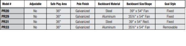 Tough-Duty 3½" O.D. pole…Provides 36" safe play area • 36" ground bury • Direct goal mount design • Heavy-duty 1-5/8" diameter braces to support backboard are included • Galvanized pole and zinc plated hardware • 5" x 5" goal mounting pattern • 10-year limited warranty on pole