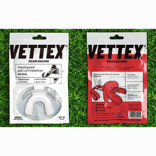 From practice to playoffs, the Markwort Vettex¨ Doubleguard Mouthguard provides durable protection and maximum comfort so you can forget about your mouthguard and focus on the game. The sleek, no-boil design ensures an easy fit while protecting teeth and lips right out of the package. Two built-in air channels allow for easy breathing and a strap keeps your mouthguard always within arm's reach. Safe for braces, orthodontics and any contact sport. Athletes in little league to the pros trust Vettex Mouthguards for unflinching strength and comfort, hit after hit and win after win.